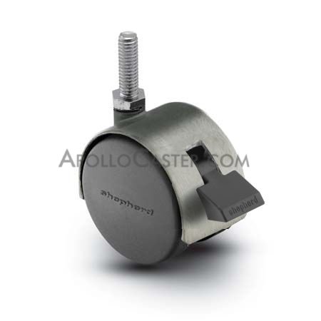 Caster; Twin; Swivel; 2" (50mm); Nylon; Threaded Stem; 1/4"-20TPI x 5/8"; Satin Chrome; Metal (zinc) body; 75#; Pedal Style Wheel Brake; Hood (Shepherd PPA50828SC-B)